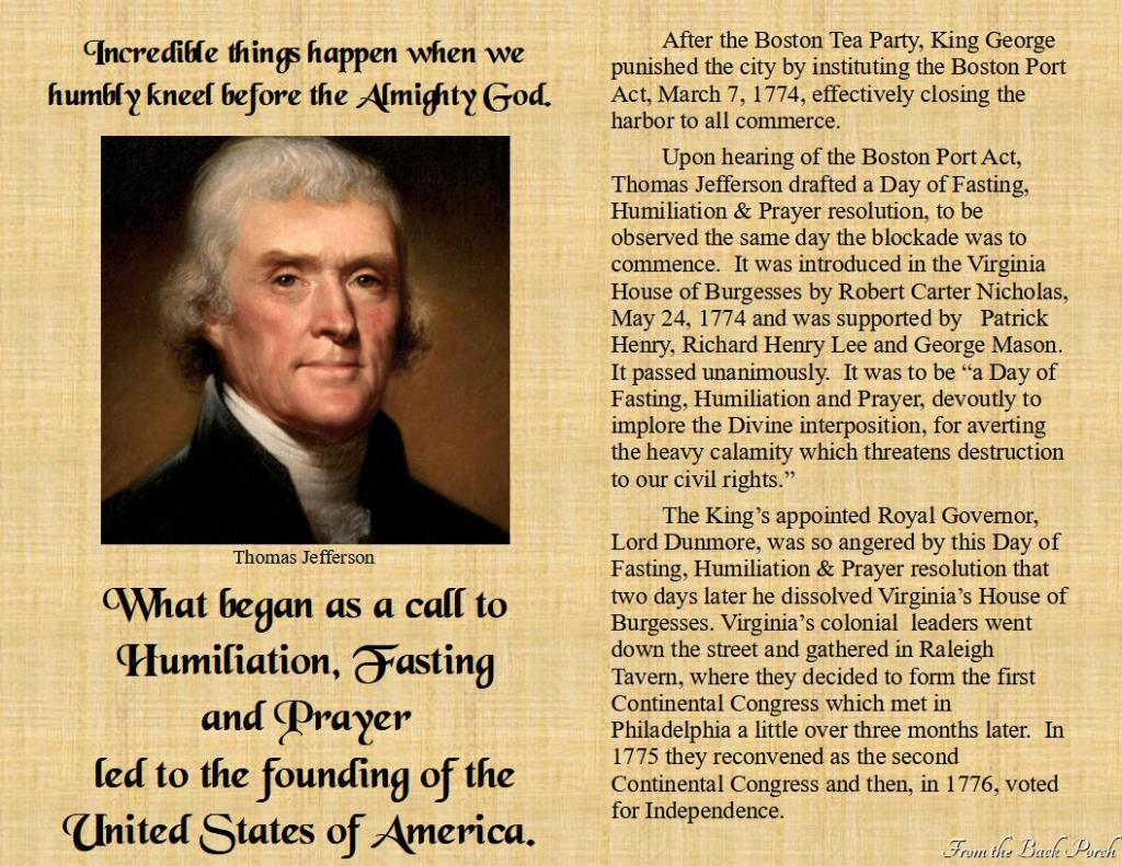 Circumstances in our nation have led to periods of fasting and praying. Time and time again our founding fathers – John Adams, Thomas Jefferson, John Hancock, George Washington, and many others – called our nation to a period of humiliation, fasting, and prayer. In 1863, in the middle of the Civil War, Abraham Lincoln proclaimed a Day of Humiliation, Fasting, and Prayer for our nation. The fast was not designed to achieve success in battle or a favorable political solution to the problems they faced. The purpose of the fast was to realign the American people in a proper position of humility before God. They knew that by first seeking God and His righteousness (Matthew 6:33) they would be in a proper position to move forward.